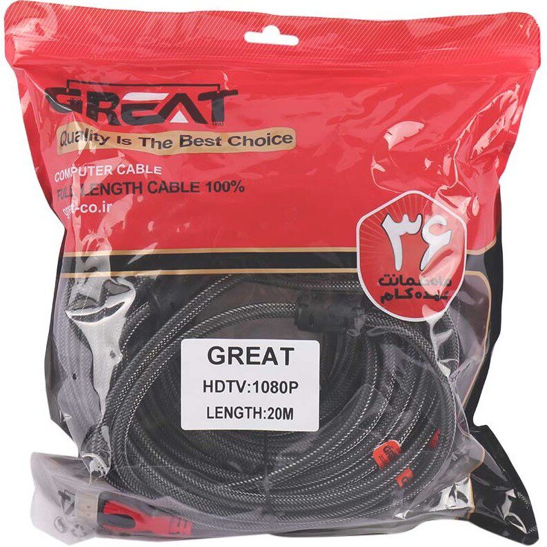 کابل HDMI GREAT مدل GR-10M با طول ۱۰ متر، ساخته شده از مس خالص، پشتیبانی از تصویر 4K و صدای دیجیتال، مناسب برای اتصال دستگاهها در فواصل نسبتاً طولانی.
