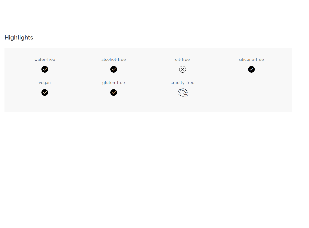بدون آب ,بدون الکل ,بدون تست حیوانی ,بدون سیلیکون ,بدون گلوتن ,وگان (گیاهی) |