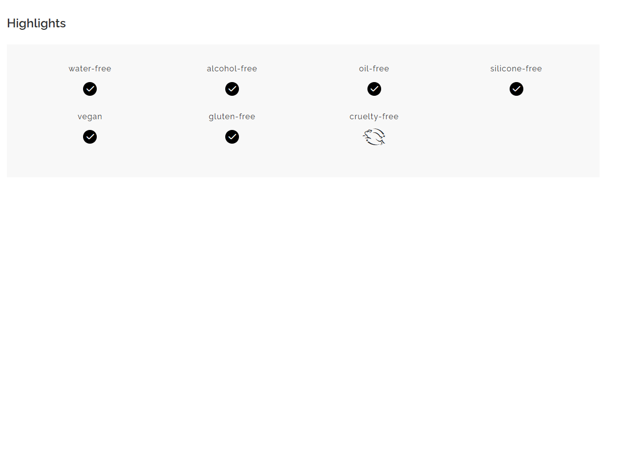 بدون آب ,بدون الکل ,بدون تست حیوانی ,بدون سیلیکون ,بدون گلوتن ,فاقد چربی (بدون روغن) ,وگان (گیاهی) |