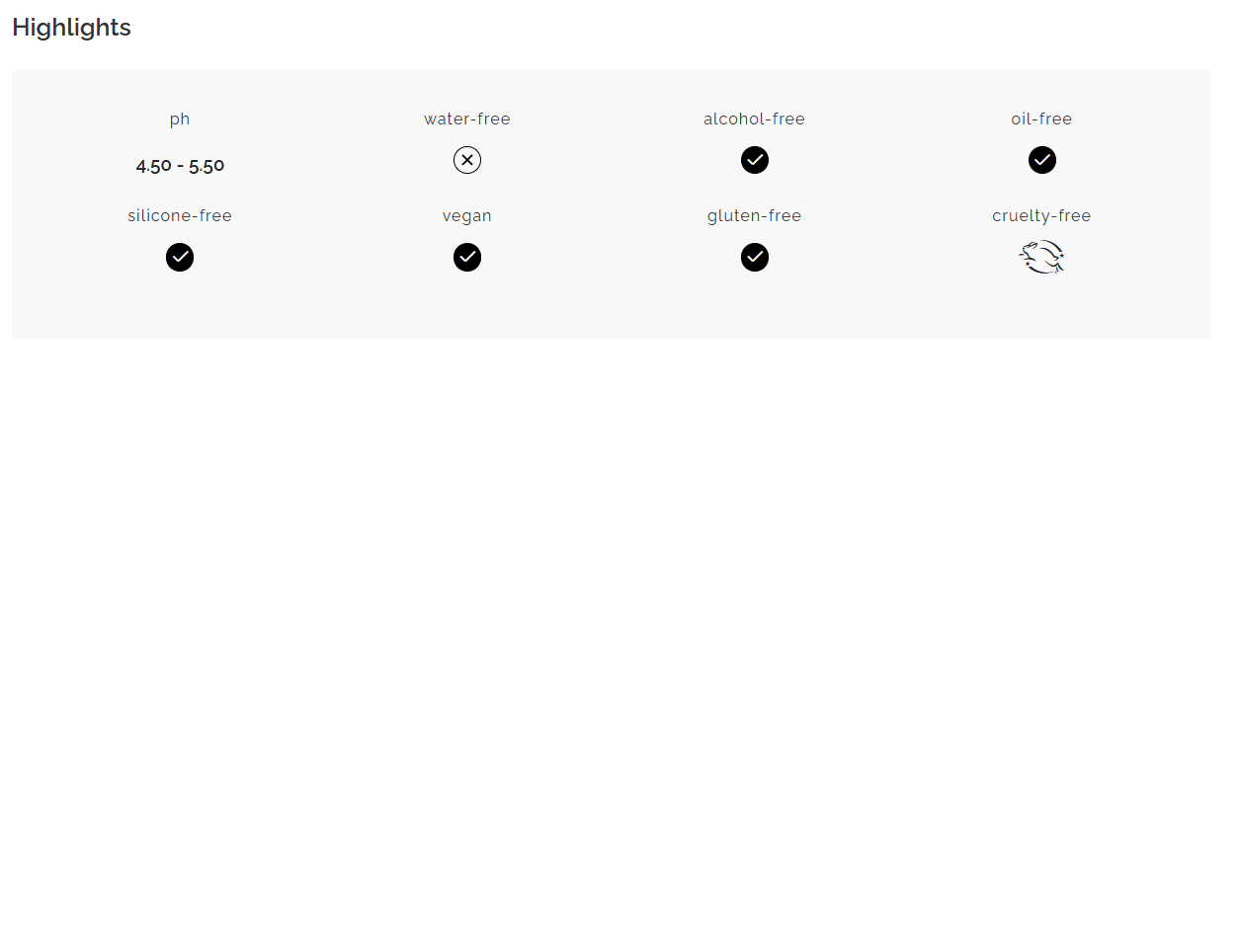بدون الکل ,بدون تست حیوانی ,بدون سیلیکون ,بدون گلوتن ,فاقد چربی (بدون روغن) ,وگان (گیاهی) |