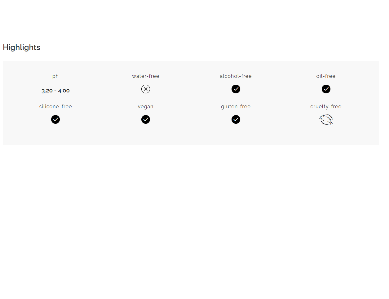 بدون الکل ,بدون تست حیوانی ,بدون سیلیکون ,بدون گلوتن ,فاقد چربی (بدون روغن) ,وگان (گیاهی) |